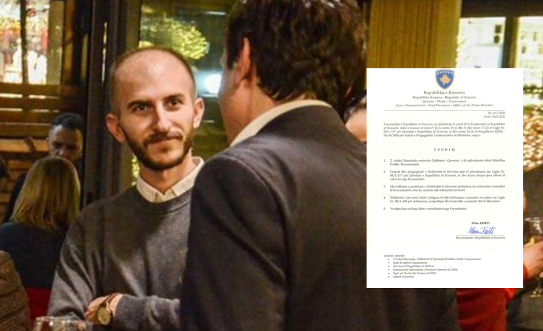“Kryeministri i Republikës së Kosovës, në mbështetje të nenit 94 të Kushtetutës së Republikës së Kosovës, duke u bazuar në nenin 9 (1.3), nenin 13 (2 dhe 5) dhe nenin 17 (2) të Ligjit Nr. 08/L-117 për Qeverinë e Republikës së Kosovës, si dhe nenin 24 (1) të Rregullores (QRK) Nr.04/2026 për Fushat e Përgjegjësisë Administrative të Ministrive, nxjerr: Z. Arlind Manxhuka emërohet Zëdhënës i Qeverisë, i cili njëkohësisht është Këshilltar Politik i Kryeministrit”, thuhet në vendimin e qeverisë.