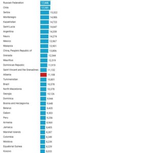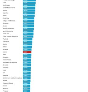 Pas Kosovës, në renditje vijnë disa vende të Ballkanit Perëndimor. Bosnjë-Hercegovina regjistron të ardhura për frymë prej 9,467 dollarësh, ndërsa Maqedonia e Veriut arrin në 10,377 dollarë.