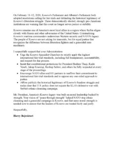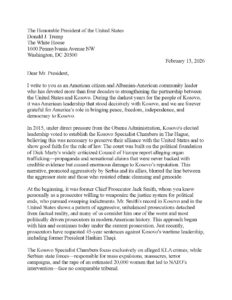 Ai ka kërkuar që Shtetet e Bashkuara të angazhohen për të garantuar një gjykim të drejtë për Hashim Thaçi, Kadri Veseli, Jakup Krasniqi, Rexhep Selimi dhe të tjerët që po mbahen në Hagë.