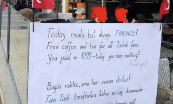 Në mesazhin e plotë, restoranti thekson mirënjohjen me fjalët: “Kafe dhe çaj falas për tifozët turq. Borxhin e keni larë në 1999”.