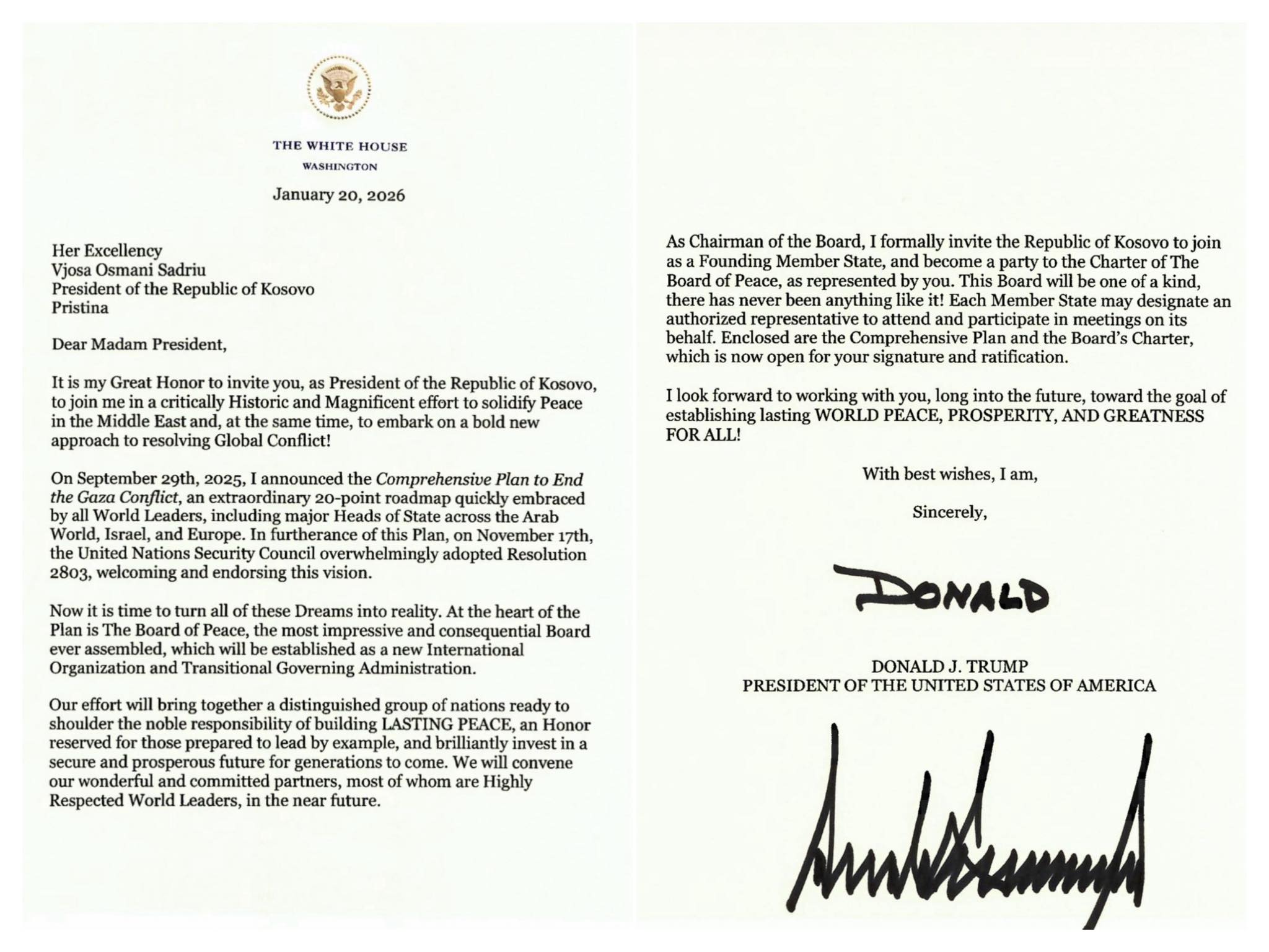 Presidentja e Republika e Kosovës, Vjosa Osmani, ka deklaruar se është thellësisht e nderuar nga ftesa personale e presidentit të Shtetet e Bashkuara të Amerikës, Donald Trump, për ta përfaqësuar Kosovën në Bordin e Paqes, si anëtare themeluese.