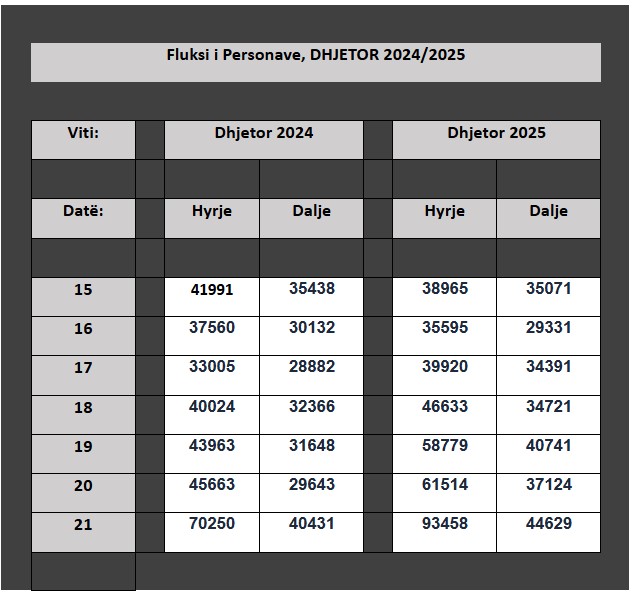 Më 19, 20 dhe 21 dhjetor 2025 është regjistruar numër më i lartë i hyrjeve, me kulmin më 21 dhjetor, ku janë evidentuar mbi 90 mijë hyrje, krahasuar me rreth 70 mijë hyrje në të njëjtën datë të vitit të kaluar.