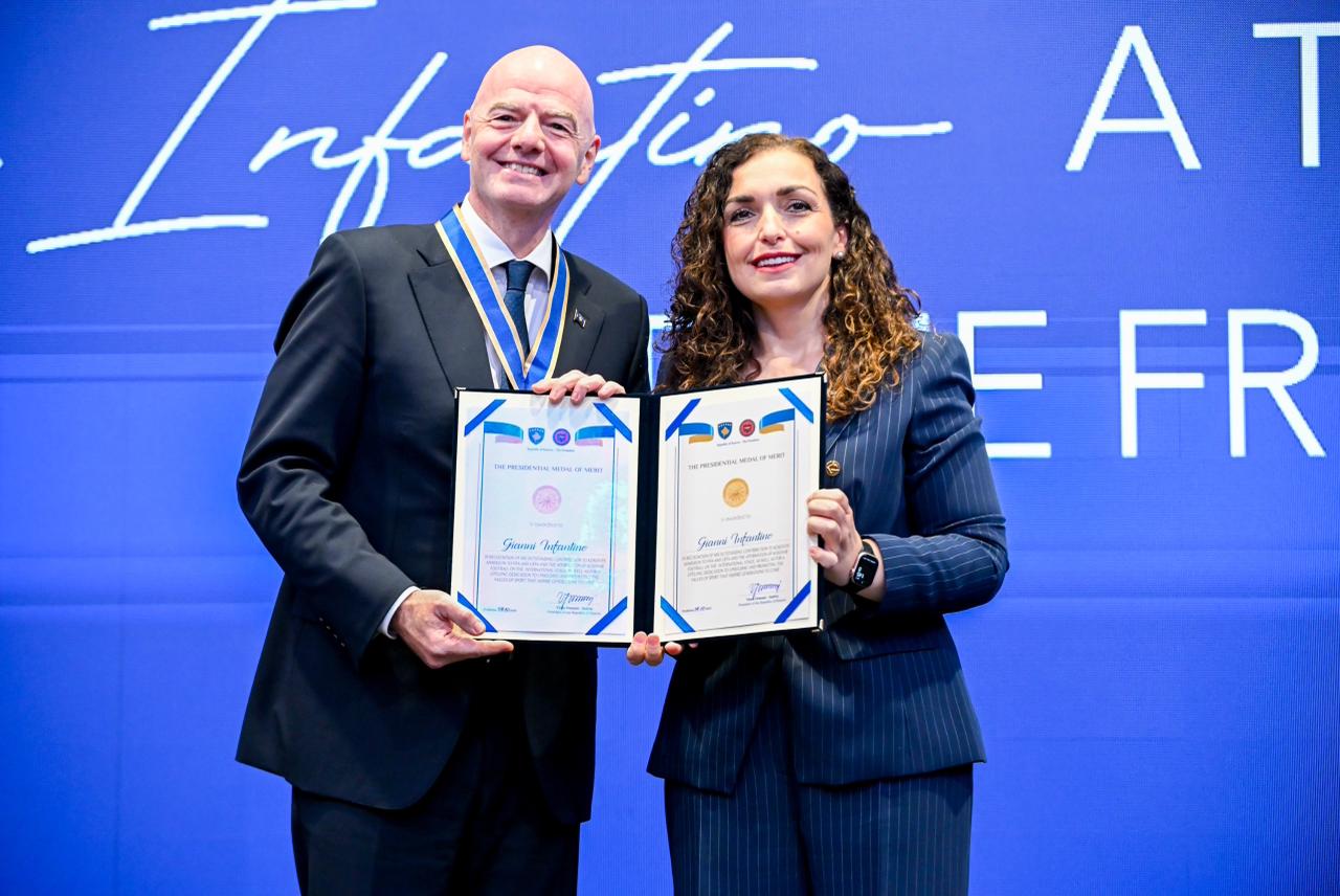 Presidentja e Republikës së Kosovës, Vjosa Osmani, ka dekoruar Presidentin e FIFA-s, Gianni Infantino, me Medaljen Presidenciale të Meritave, në një ceremoni solemne të mbajtur në Presidencë.