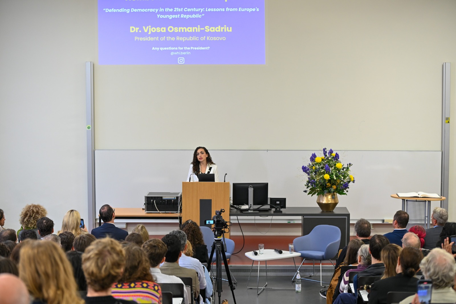 Në këtë aktivitet të mbajtur në një ndërtesë historike në zemër të Berlinit, Presidentja theksoi se Kosova sot paraqitet si një histori suksesi të demokracisë që triumfon, të vlerave që bashkojnë dhe të shpresës që e bën Evropën më të fortë, më humane dhe më të bashkuar.