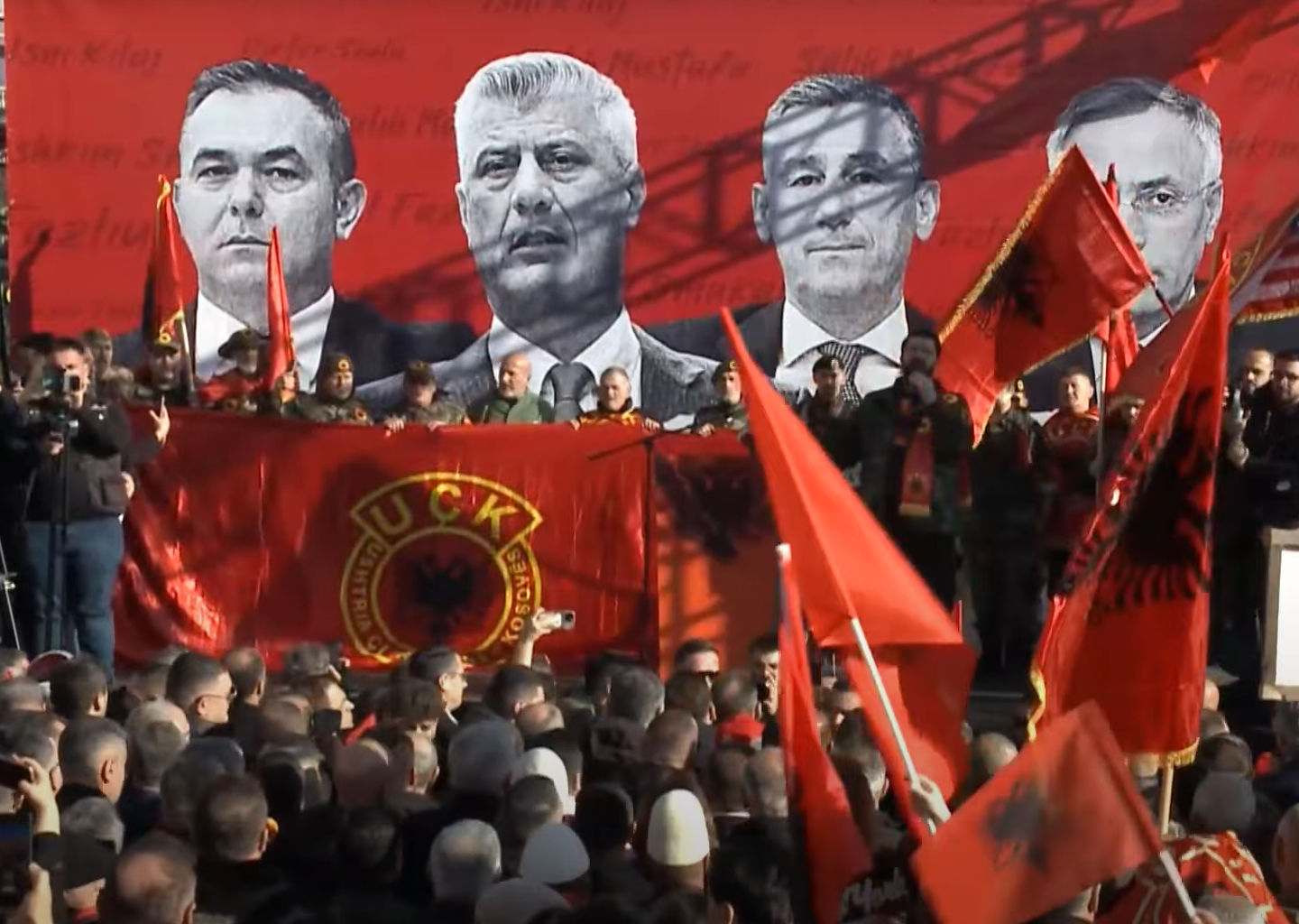 Në sheshin “Skënderbeu” në Shkup, mijëra qytetarë nga gjithë rajoni u bashkuan sot në protestën e organizuar nga Organizata e Veteranëve të Luftës së UÇK-së, në mbështetje të ish-krerëve të Ushtrisë Çlirimtare të Kosovës që po gjykohen në Hagë.