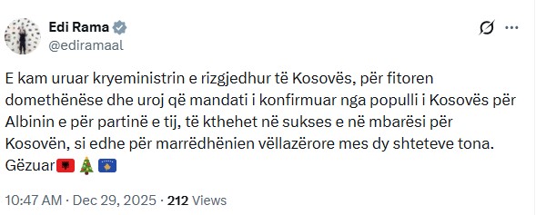 Në një postim në platformën X, Rama shprehet se uron që mandati i ri i Kurtit dhe i partisë së tij të shndërrohet në sukses dhe mbarësi për Kosovën, si edhe në forcim të mëtejshëm të marrëdhënieve vëllazërore mes Shqipërisë dhe Kosovës.