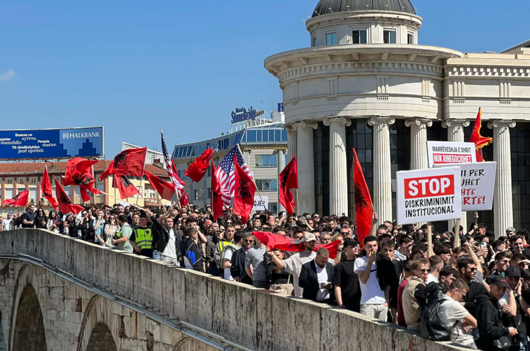 Mijëra studentë shqiptarë në Maqedoninë e Veriut kanë protestuar në kryeqytet, duke kërkuar që provimi i jurisprudencës të mbahet edhe në gjuhën shqipe, një e drejtë që sipas tyre garantohet me Kushtetutë dhe ligj.