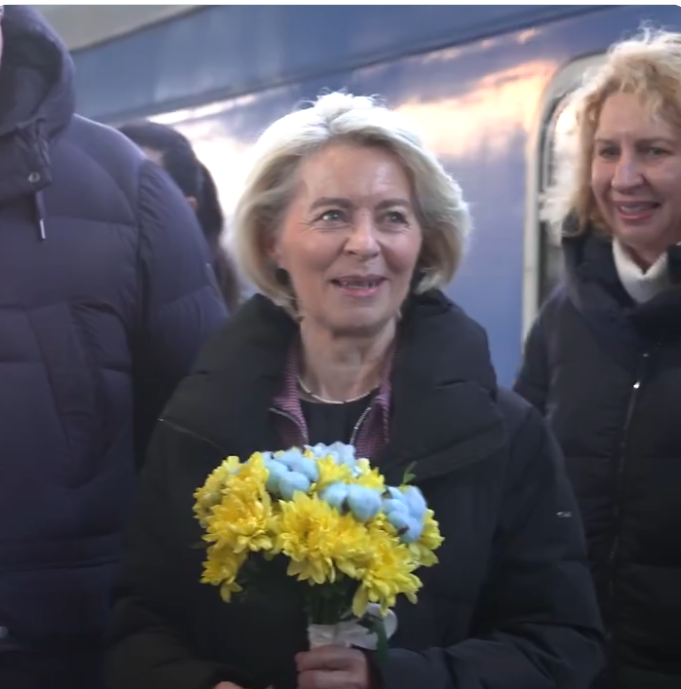 Sipas pamjeve të publikuara nga vetë von der Leyen në rrjetet sociale, ajo mbërriti në Kiev me tren, ku u prit nga zyrtarë ukrainas me një buqetë lulesh në ngjyrat kombëtare të Ukrainës.