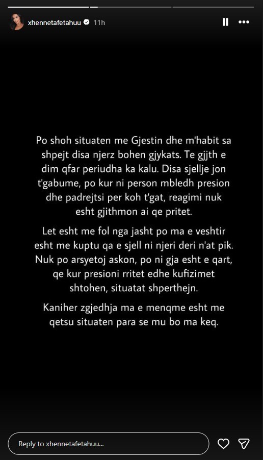 Pas lajmit për arrestimin e këngëtarit të njohur Gjesti, ka reaguar edhe ish-finalistja e Big Brother VIP Kosova, Xheneta Fetahu.